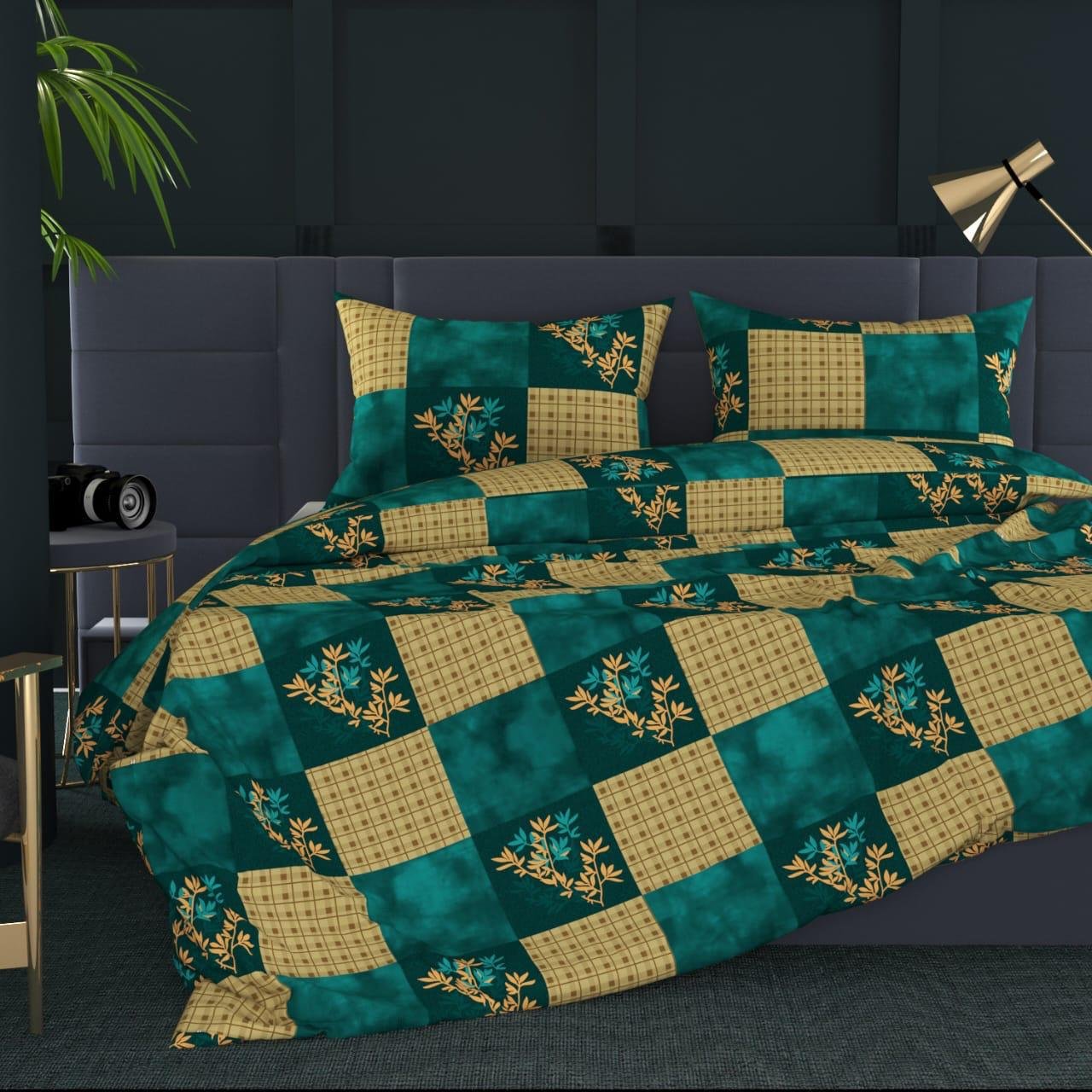 A luxurious bedsheet set featuring an alternating pattern of emerald green squares with gold botanical designs and matching checkered patterns. This sophisticated patchwork-style bedding creates an elegant balance between solid colors and floral motifs, perfect for adding a rich, regal touch to any bedroom décor.
