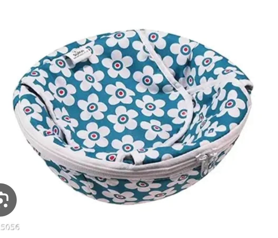 A zippered, insulated roti cover featuring a cheerful blue and white floral print. Designed to keep chapatis, rotis, and parathas warm and fresh for longer periods, this cover is ideal for serving bread at home or carrying tiffin lunches.