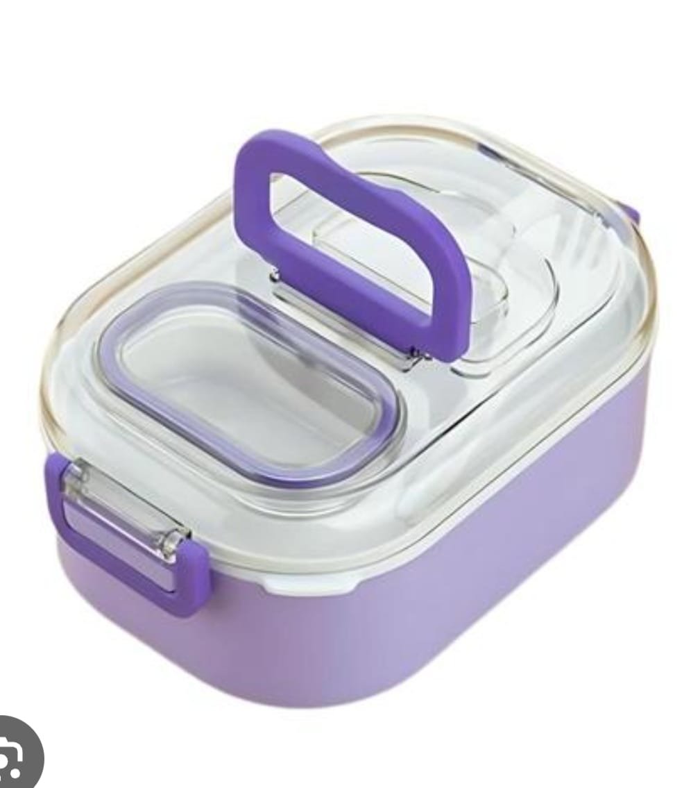 A stylish leak-proof lunch box in a pastel purple shade, featuring secure locking clips, a built-in handle, and a transparent lid with an extra compartment. Ideal for carrying meals and snacks to school, office, or travel, it keeps food fresh and portions separated.