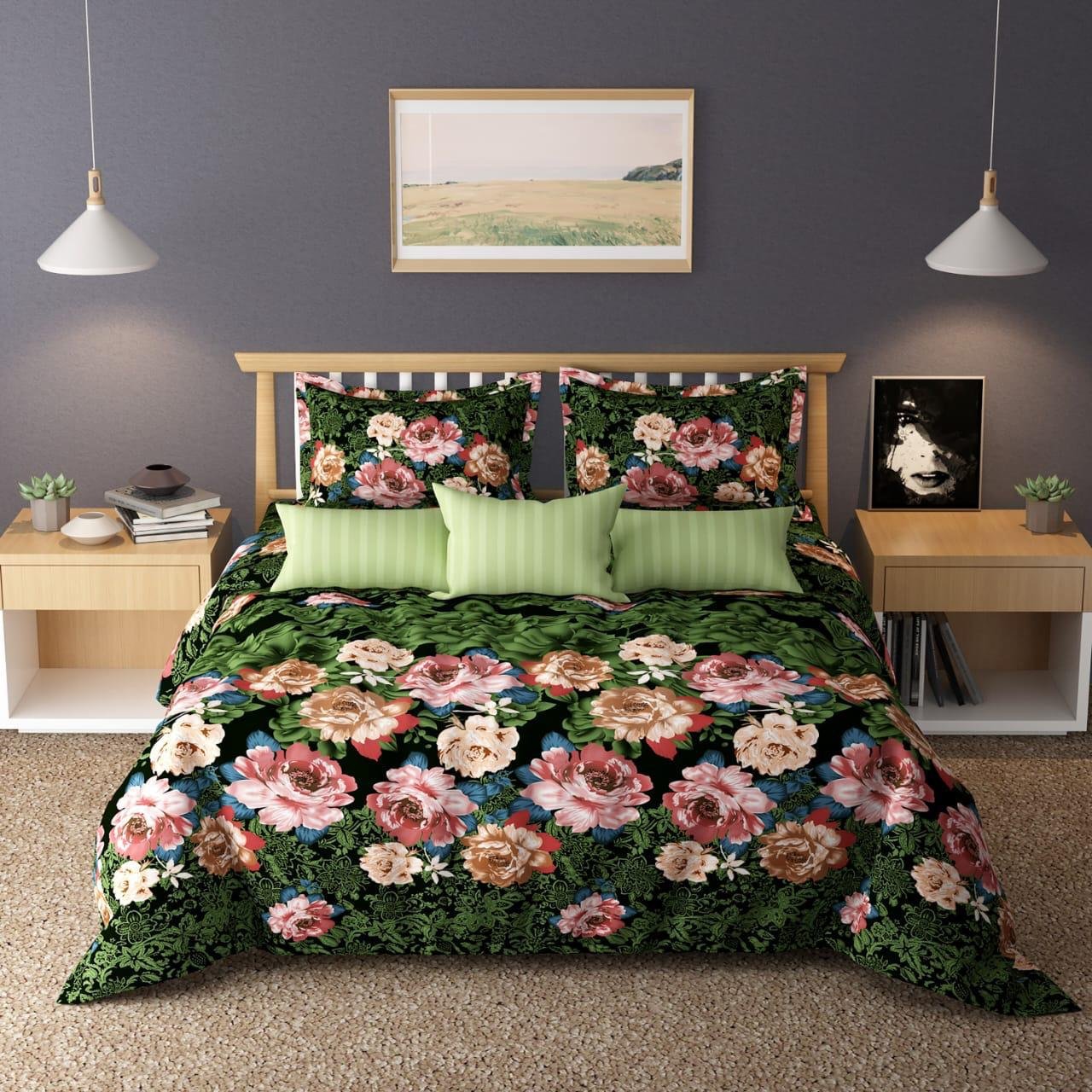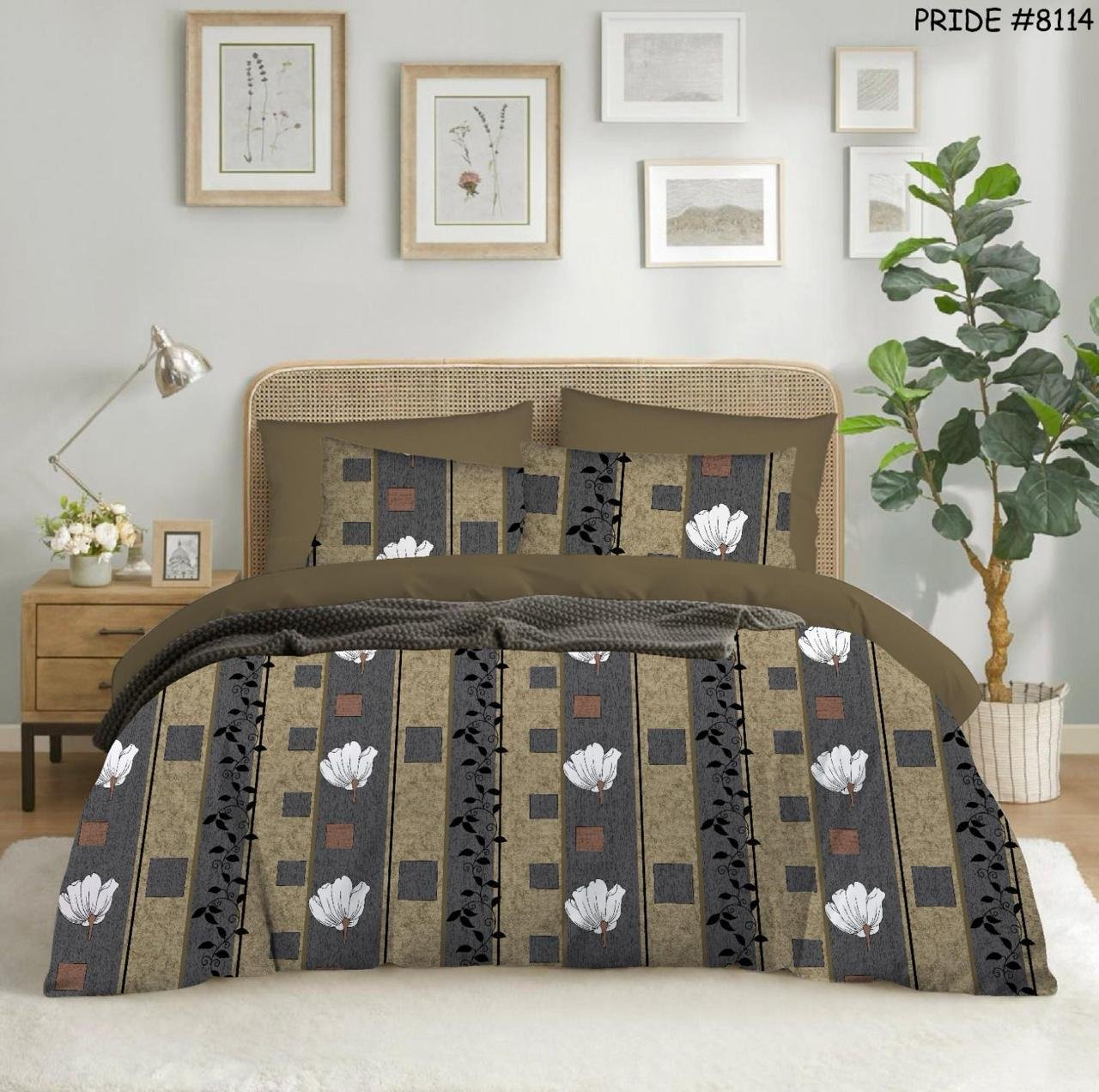 This modern bedsheet set showcases a geometric pattern in earthy brown and olive hues, highlighted by clusters of white daisies. A stylish choice for contemporary interiors, it delivers a bold blend of fashion and comfort with matching pillow covers.