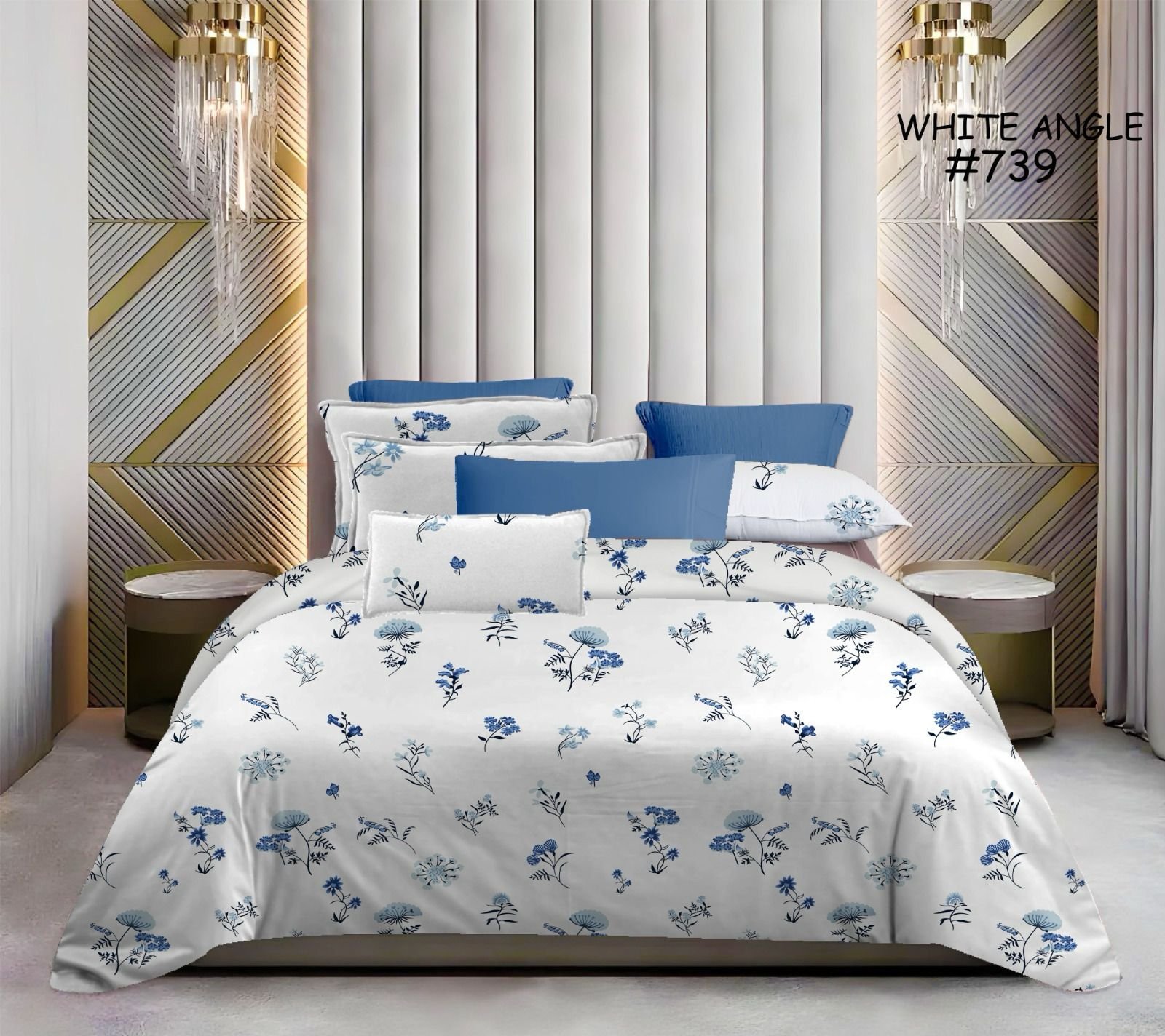 A charming bedsheet set featuring scattered blue wildflowers and delicate botanical sprigs on a clean white background. Enhanced with matching blue pillow covers, this design evokes the serenity of a peaceful meadow, perfect for creating a calming and refreshing sleep environment.